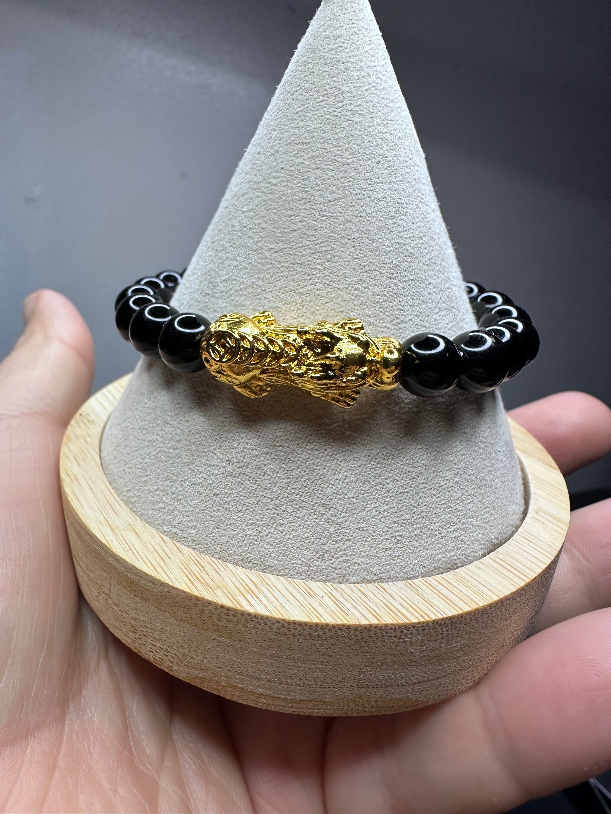 Authentic 8mm Onyx beads with Gold plated Dragon Charm. Known for its luck and protection qualities