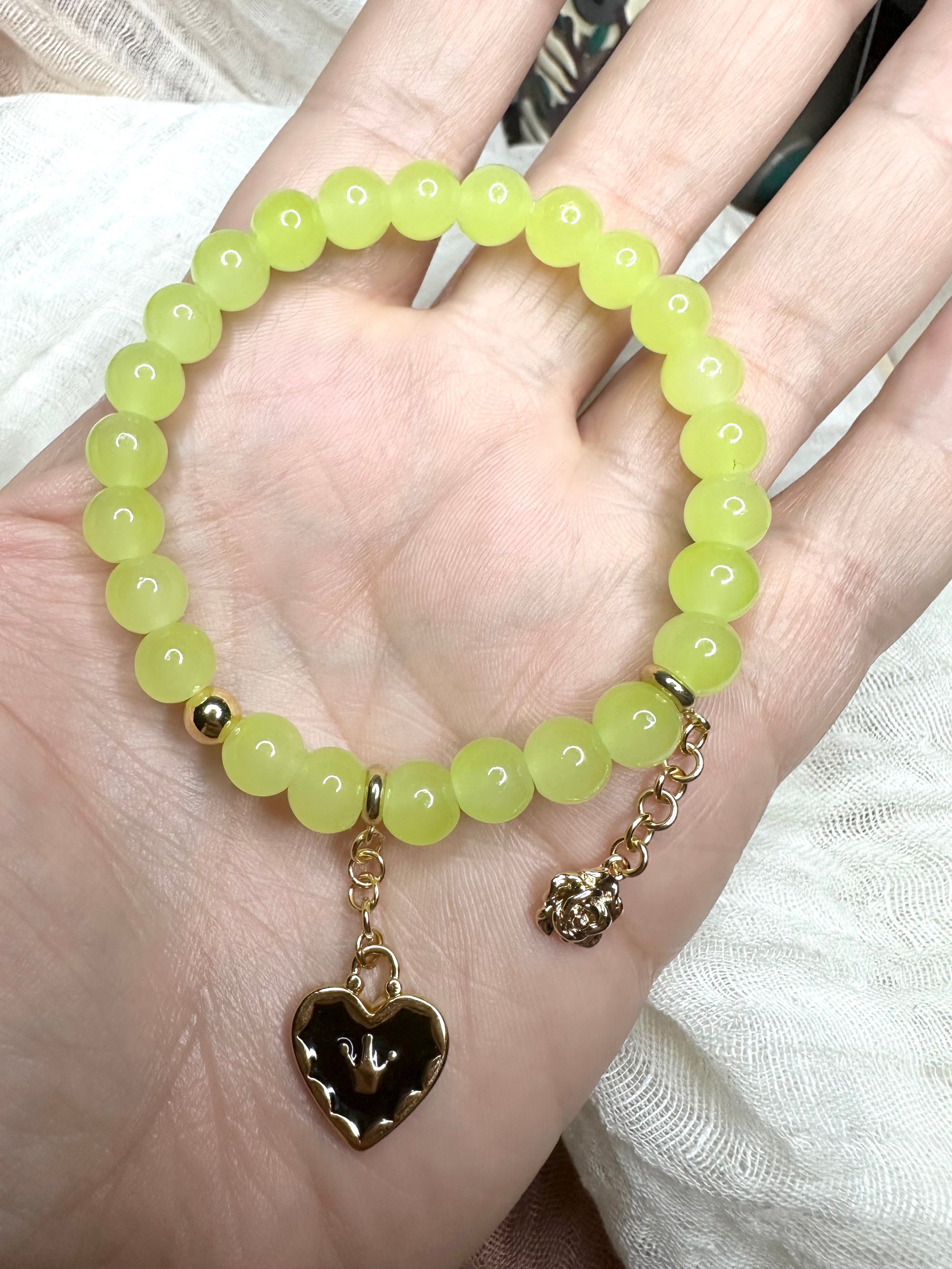 8MM Lime Green glass beads w/ Heart and Rose Gold plated Charm